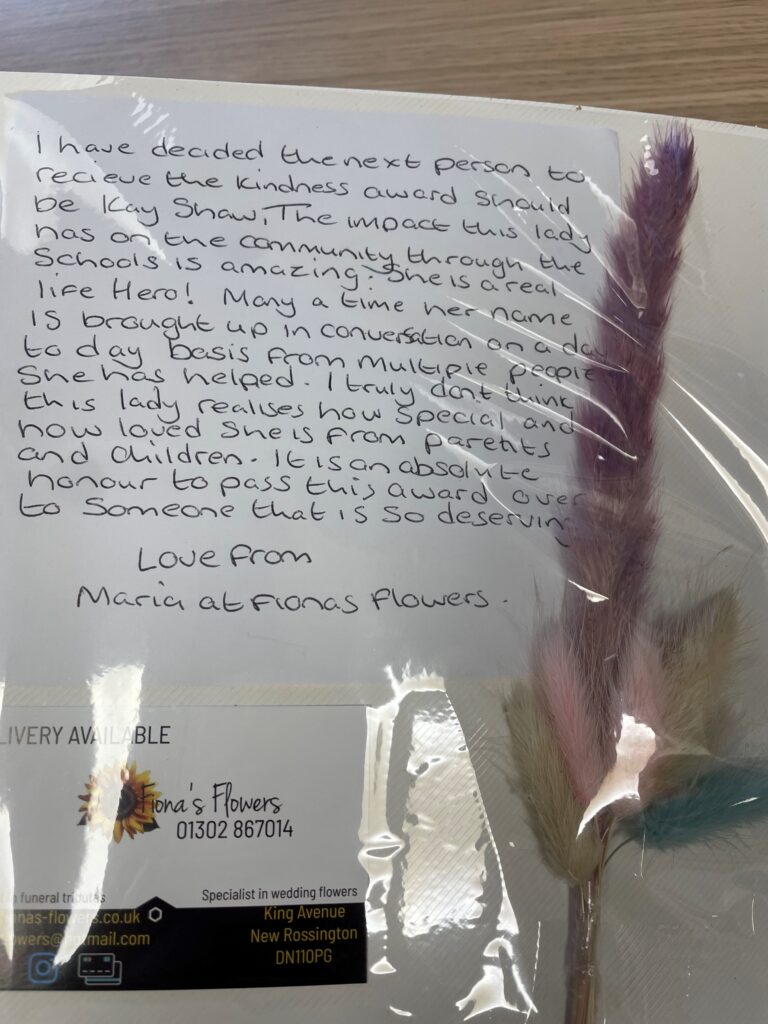 Kay Shaw was surprised by parish councillors in school who handed her the Rossington Community Kindness Award, passed around the community through nomination via the Parish Council and the Royal Care home.